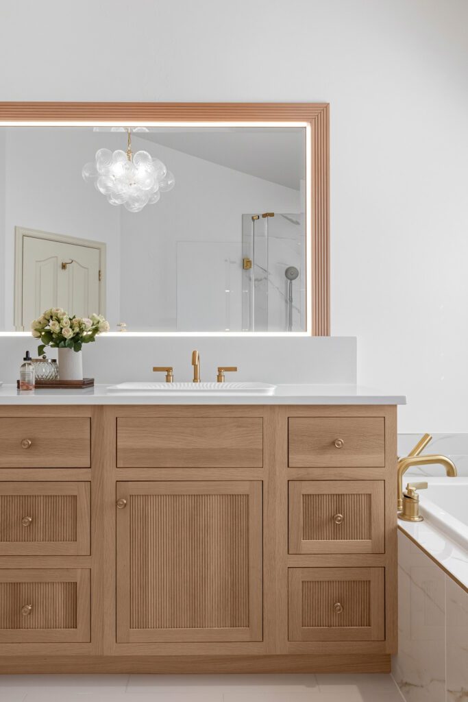 - Lighting has become easier to work with than ever before, and can be manipulated to adjust color temperatures throughout the day. Soft ambient lighting and LED cove lights offer a truly spa like relaxing environment, and undercabinet toe kick lights can be movement sensitive, coming on when they sense someone nearby in the middle of the night- creating a soft nighttime glow without overhead glare, and enhancing night time safety as well. Vanities can be lit to provide the optimal light for grooming and makeup application.