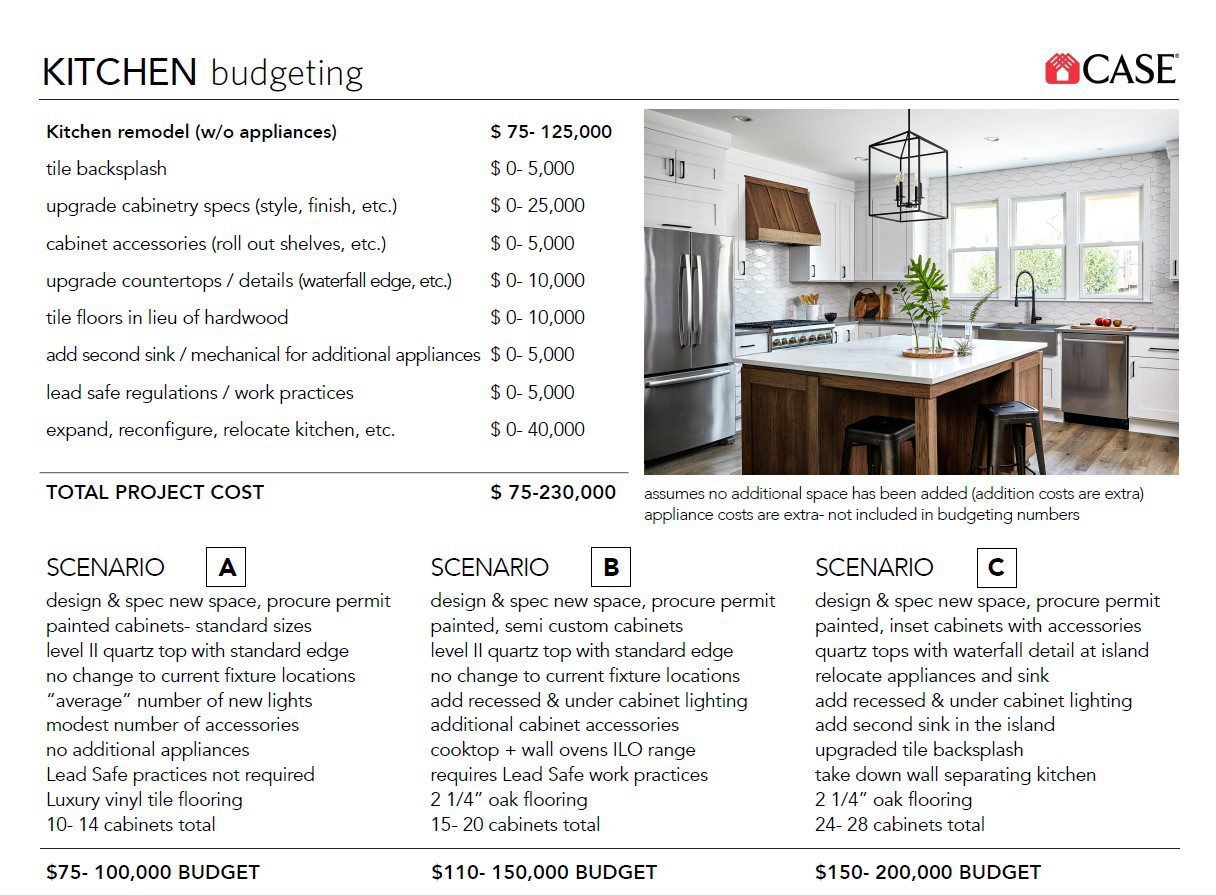 Budgeting for a kitchen remodeling project can be tricky. The “type” of home (condo, townhouse, single family), age of the home (need to update utilities, lead paint hazards), location (urban with no parking), design/ layout of the kitchen, size of the space and material selections can all influence the final price of the project. So, how much does it cost to remodel a kitchen? It depends…