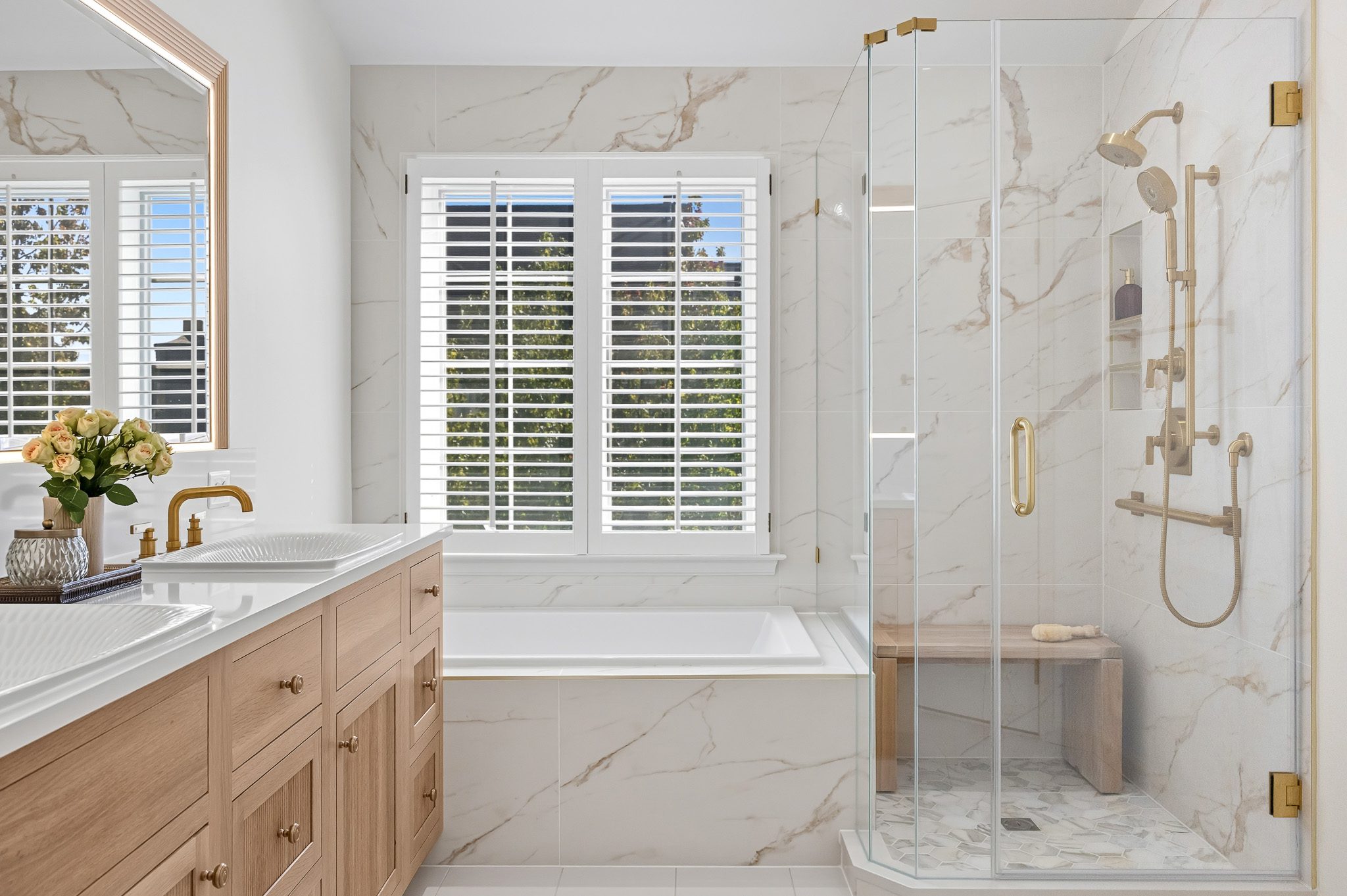 This serene primary bath strikes the perfect balance of warmth and sophistication. Natural wood tones pair beautifully with the tile, creating a space that feels inviting yet refined. The brushed brass fixtures and lighting add a touch of modern luxury, while the fluted vanity detailing and integrated LED mirror bring subtle texture and glow.