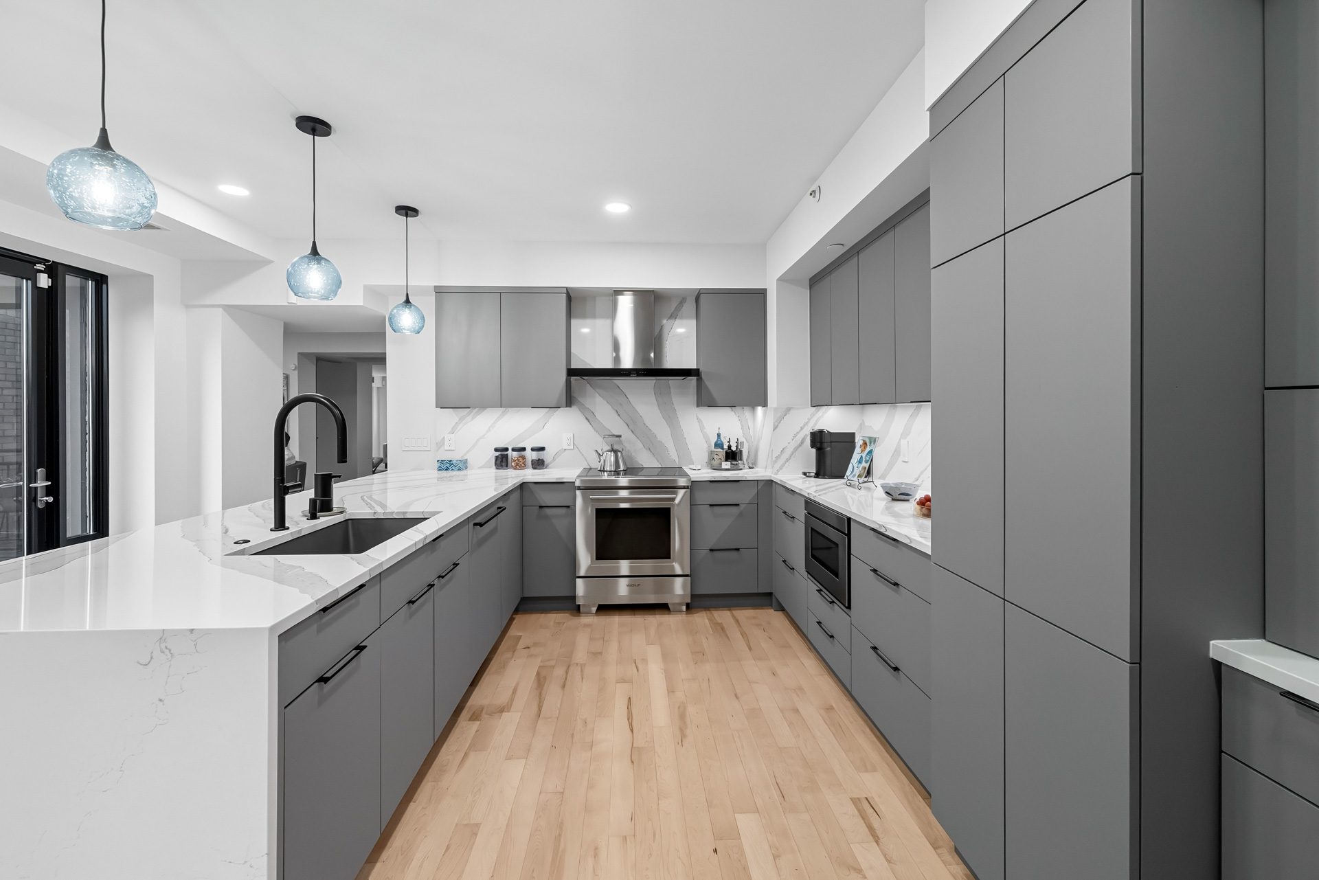 This contemporary kitchen strikes the perfect balance between bold design and understated elegance. Matte gray cabinetry and sleek black hardware create a sophisticated foundation, while waterfall-edge quartz countertops introduce movement and visual texture.